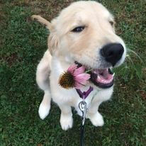 FRANKIE JO, Charlie May's daughter from her 1st litter, is the big-time ball player of our girls. She loves playing fetch all the time and she is really, really good at catching anything thrown her way! FRANKIE produced a litter of 9 very special and gorgeous puppies Jan. 2022. Also, in Jan. 2023, FRANKIE had an equally magnificent litter of 13 puppies! Both litters are in very loving homes!! FRANKIE absolutely loves people and loves being pet and snuggled. She is a stunning Golden beauty and is also incredibly intelligent!
